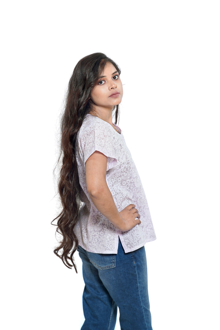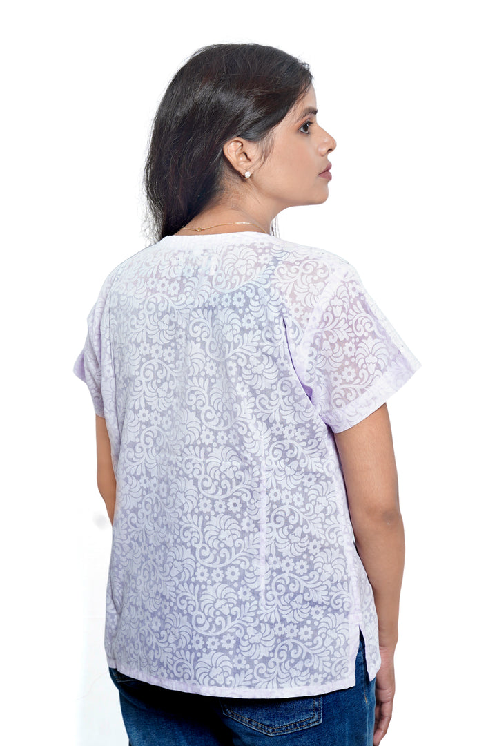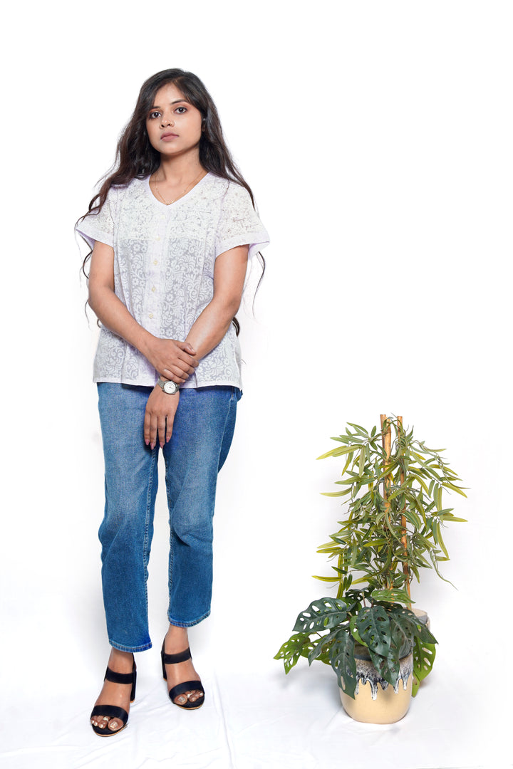 Crafted from exquisite Brasso Cotton, this top offers a subtle self-design and a rich drape that moves beautifully. The soothing Lavender hue is beautifully contrasted by meticulous Chikankari embroidery, while the delicate Mukaish (or Kamdani) work scattered across the yoke catches the light with every movement